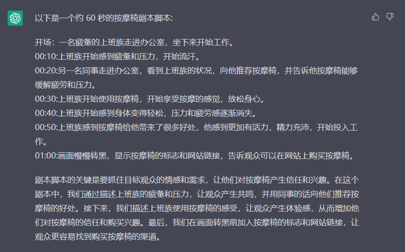 1、你是世界一流水平的编剧,请告诉我,如何用chatGPT写一个60s的按摩椅的剧本脚本