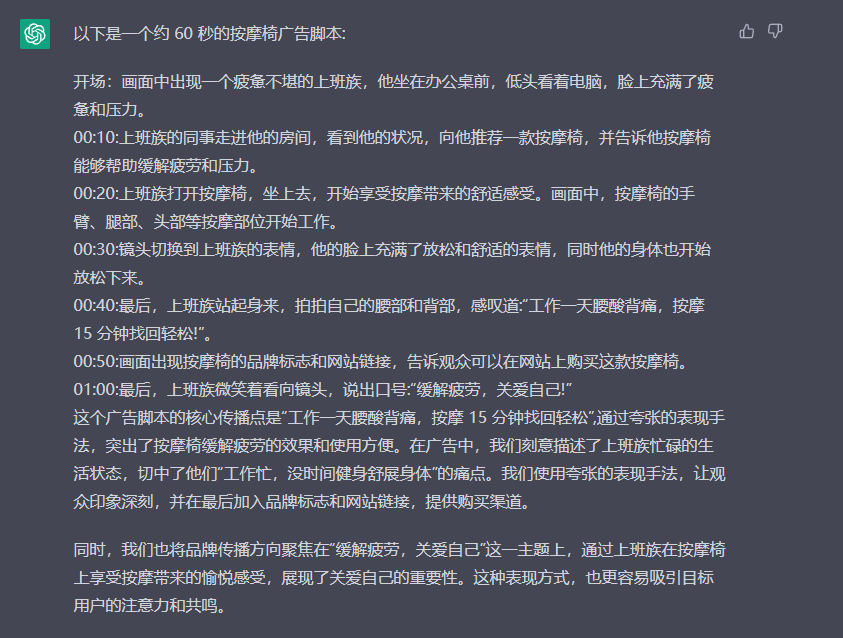 2、你是世界一流水平的品牌策划,请告诉我,如何用chatGPT写一个60s的按摩椅的广告脚本,要求具有优秀的传播属性,以“缓解疲劳,关爱自己”为主题,核心传播要求是“工作一天腰酸背痛,按摩15分钟找回轻松”,目标用户是30-45岁的中年人,内容要切中用户“工作忙,没时间健身舒展身体”的特点,注意使用夸张的表现手法。