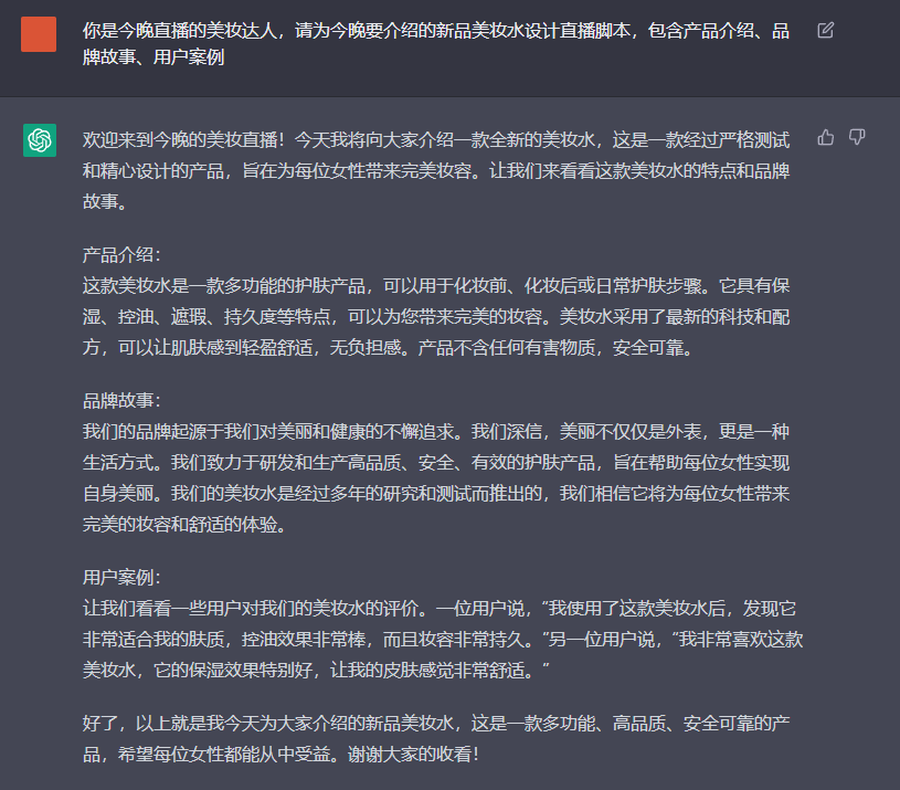 3、你是今晚直播的美妆达人,请为今晚要介绍的新品美妆水设计直播脚本,包含产品介绍、品牌故事、用户案例。