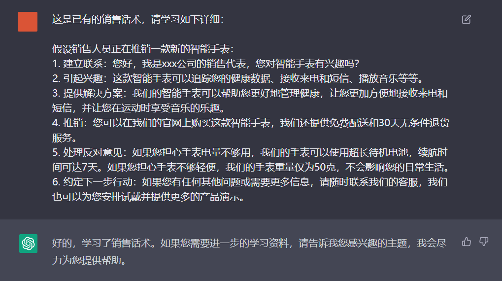 可以从销售人员的工作记录、销售培训材料、竞争对手的销售话术或者行业标准的销售话术中收集到。输入到ChatGPT中进行学习,让ChatGPT能够理解这些话术的含义和用法。