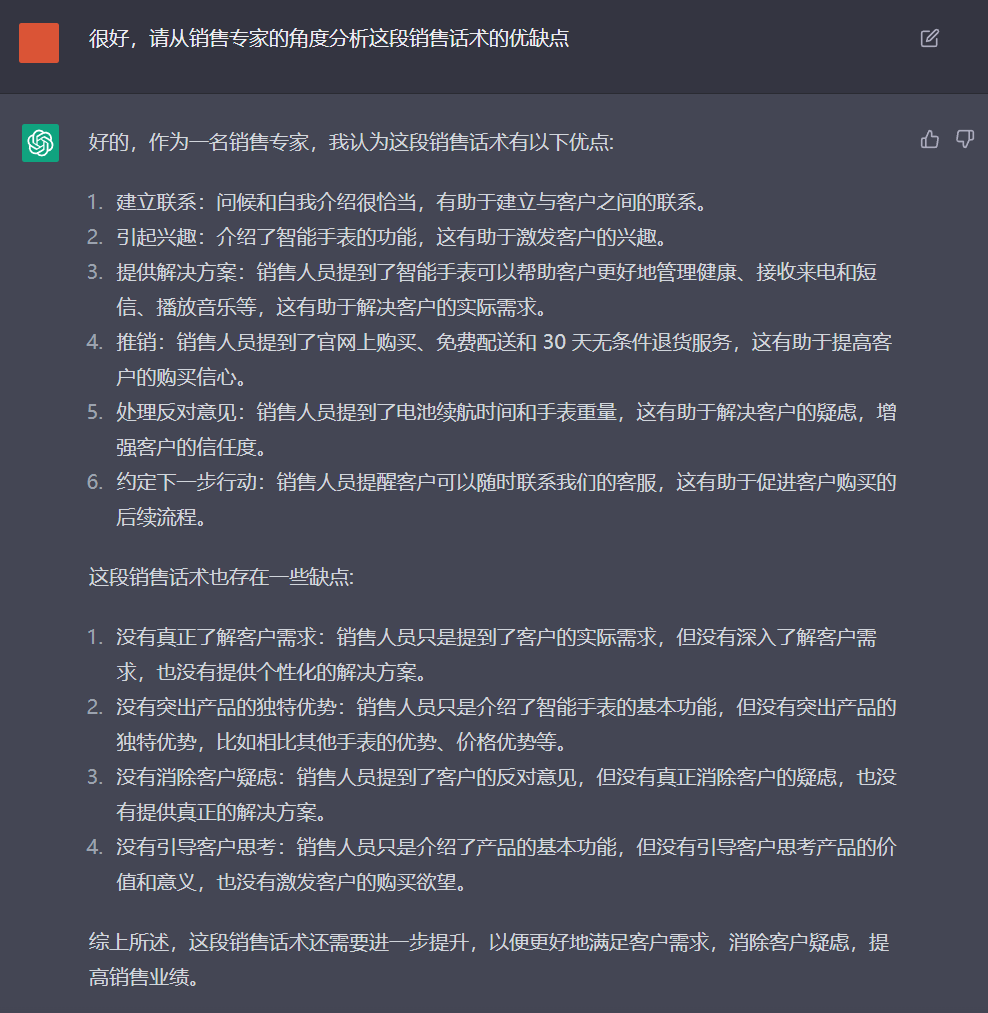 通过ChatGPT生成的结果,分析已有销售话术的优缺点。