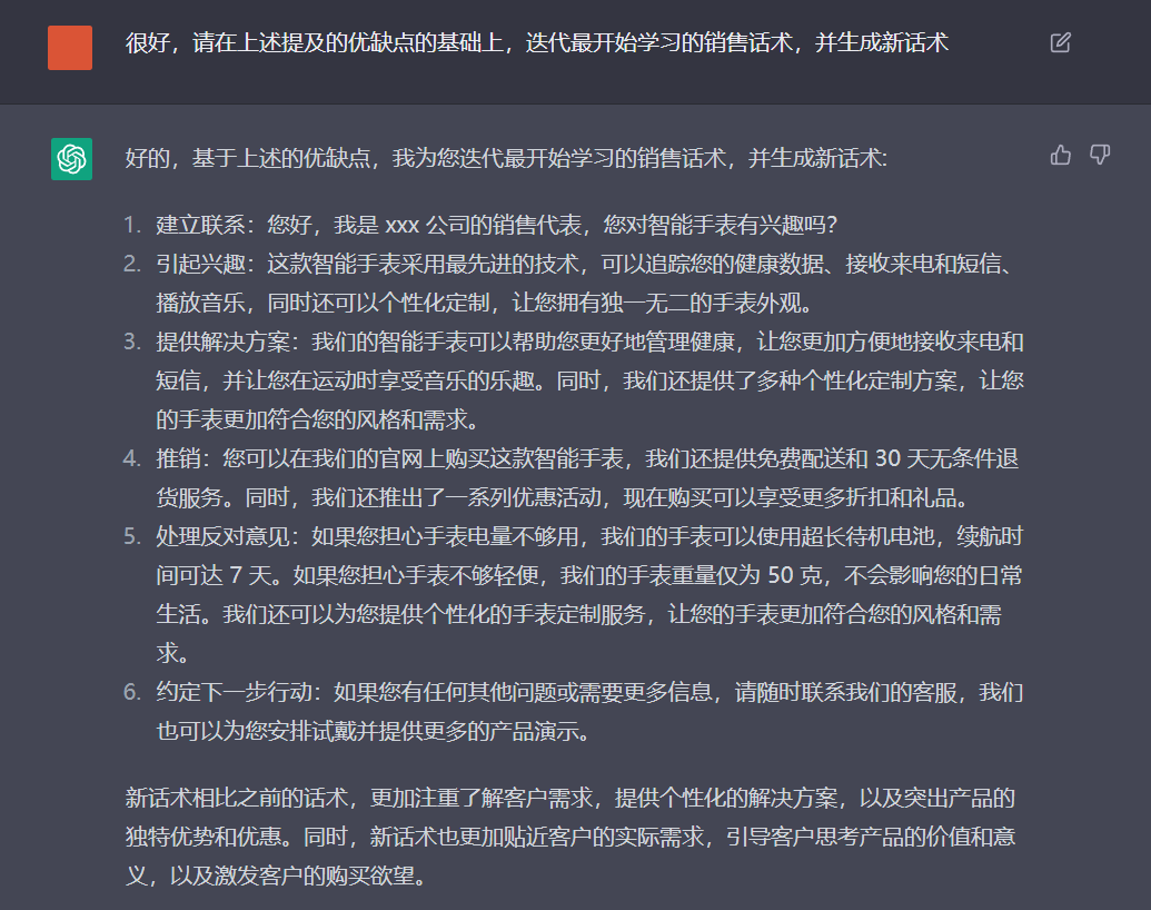 根据ChatGPT生成的结果和分析的优缺点,可以针对性地迭代一版新的销售话术。新的销售话术需要更加符合受众的需求和喜好,更加自然和流畅,更加有说服力和影响力。