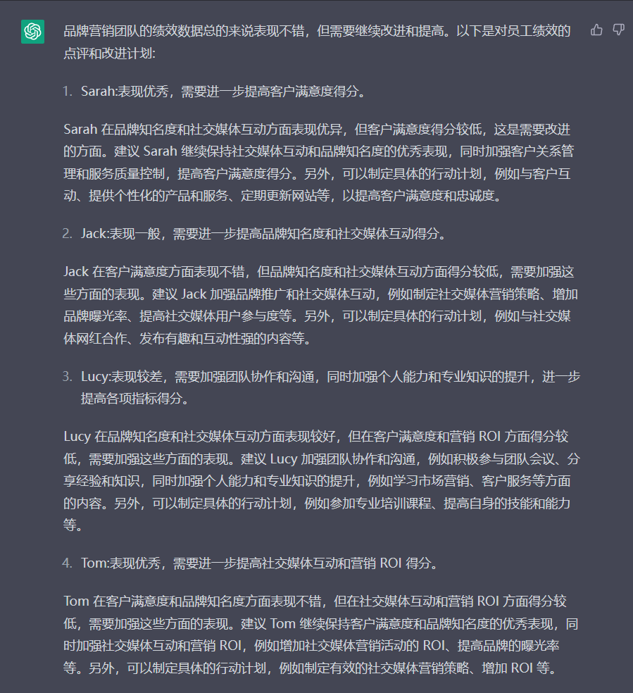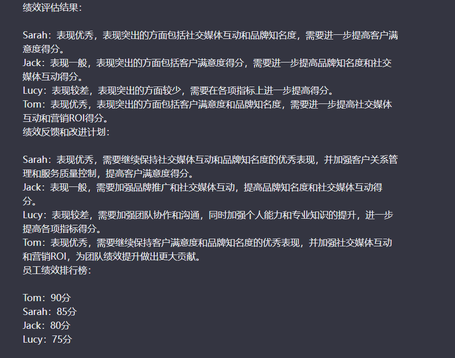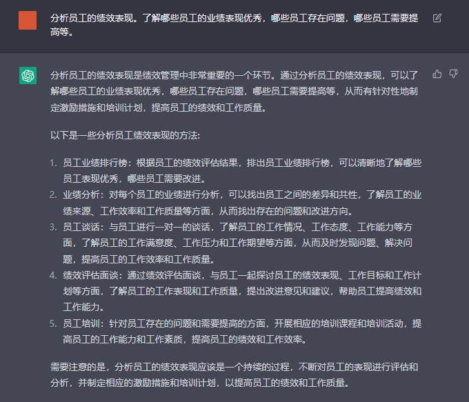 通过ChatGPT生成的结果,分析员工的绩效表现。了解哪些员工的业绩表现优秀,哪些员工存在问题,哪些员工需要提高等。