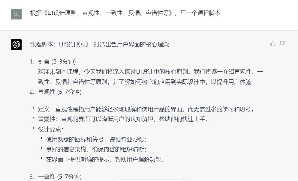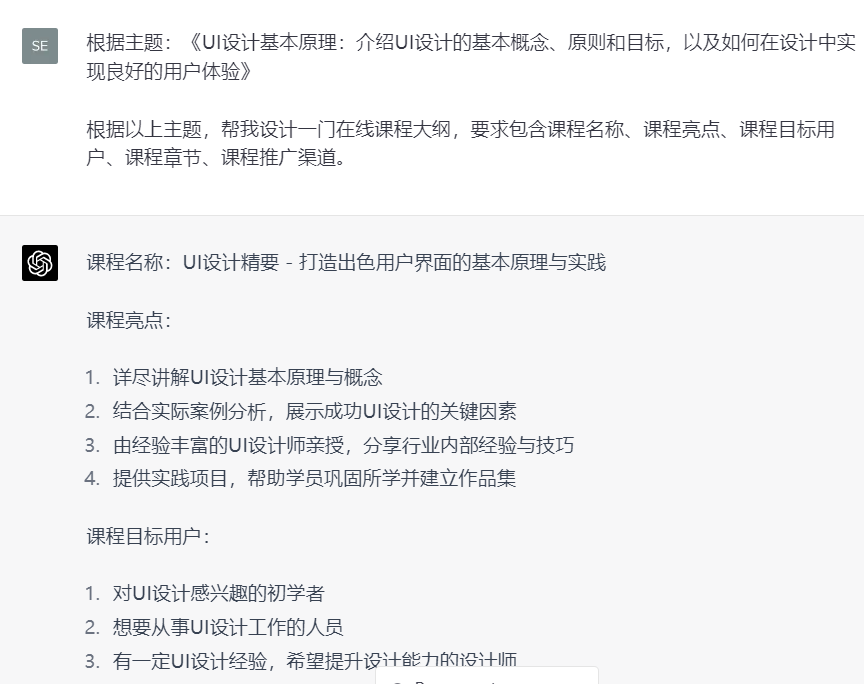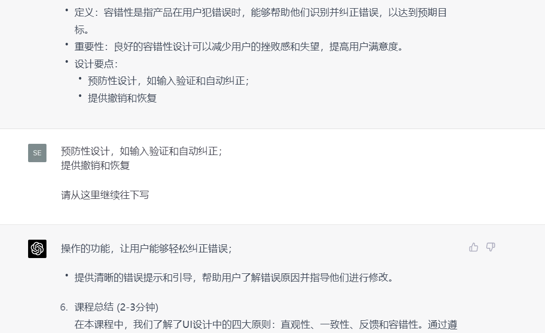 第四步:针对课程大纲里面的单独小节进行提问,让Chatgpt根据上面提问的回复,进行总结,最后生成对应主题的章节内容。